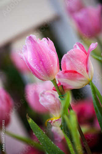 © captainweeraphan, Fototapeta premium Pink tulips in the garden background.