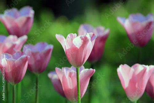 Fototapeta premium Pink tulips in the park in spring on a blurry background