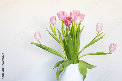 © Scope Images, Fototapeta premium Pink tulips in white vase against white background