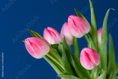 Fototapeta premium Pink tulips on dark blue background, spring flowers banner, greeting card photo