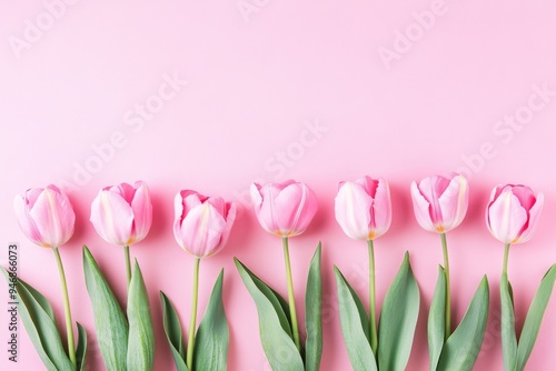© 为轩 张, Naklejka premium Pink Tulips on Pink Background in Flat Lay Top View, Featuring Space for Text, Ideal for Happy Mother’s Day or Women’s Day Celebration, Minimal Style Spring Floral Frame with Copy Space