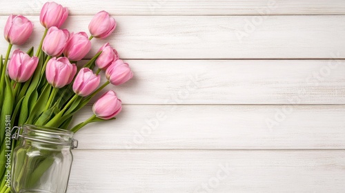 © Solikah, Fototapeta premium Pink Tulips on White Wooden Background
