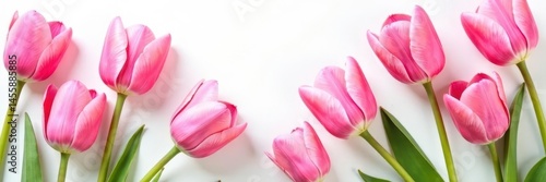 © photohappy, Fototapeta premium Pink tulips scattered on white, vibrant blooms , macro, still life