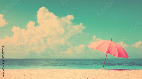 © tashechka, Fototapeta premium Pink umbrella stands on sandy beach under blue sky with clouds