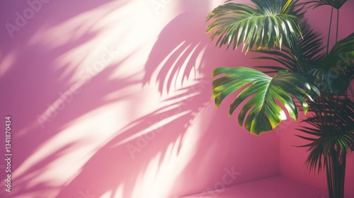 Naklejka premium Pink Wall with Tropical Plant and Sunlight Shadows