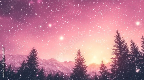 © Nas, Fototapeta premium Pink Winter Wonderland: Snowy Mountains and Silhouetted Trees at Sunset