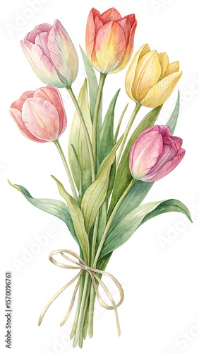 © Khaleda, Fototapeta premium Pink yellow red tulips watercolor bouquet flowers