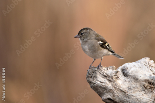 Fototapeta premium pinzón vulgar (Fringilla coelebs) posado en un tronco seco con fondo marron