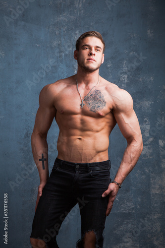 © okfoto, Fototapeta premium Pionowe ujęcie muskularnego mężczyzny z nagim torsem. Model fitness w dżinsach na szarym tle.