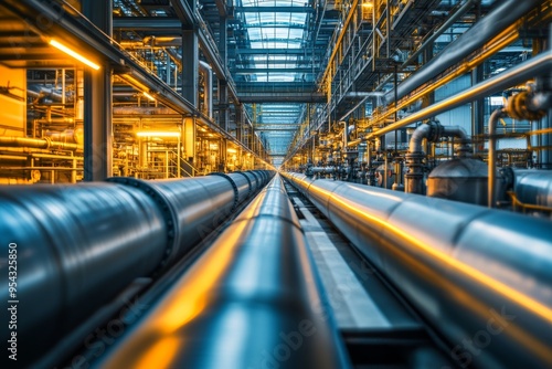 © Yevhen, Fototapeta premium Pipeline transport for petrochemicals, gas, and oil processing in manufacturing facilities