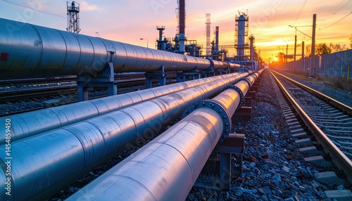 © Kitta Studio, Naklejka premium Pipes and Tracks at Industrial Facility During Sunset Reflection