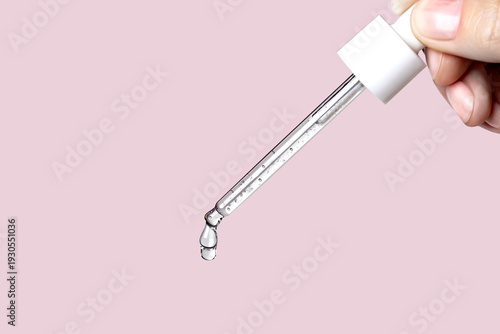 Fototapeta premium Pipette with serum in hand. Drips drop isolated on pink background, copy space photo close up