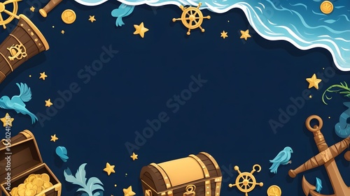 Obraz premium Pirate background with treasure chest, starry sky, fish, pirate ship,...
