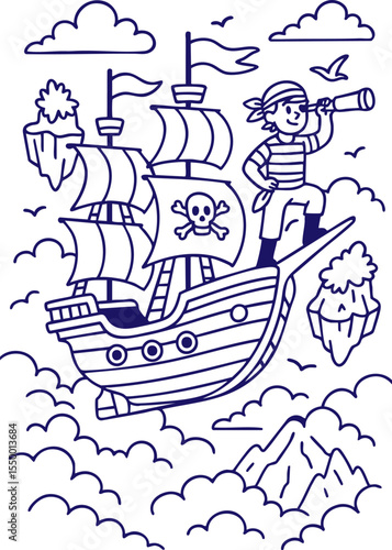 Fototapeta premium Pirate boy looking through telescope on flying ship in sky