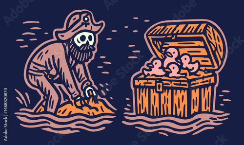 Obraz premium Pirate Hand Drawing of Skeleton with Treasure Chest and Ducks