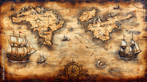© Thiago, Fototapeta premium Pirate map with pirate ships, islands and nautical signs. drawing of an ancient treasure map for medieval epic fantasy adventure. Pirate Treasure Map. Illustration