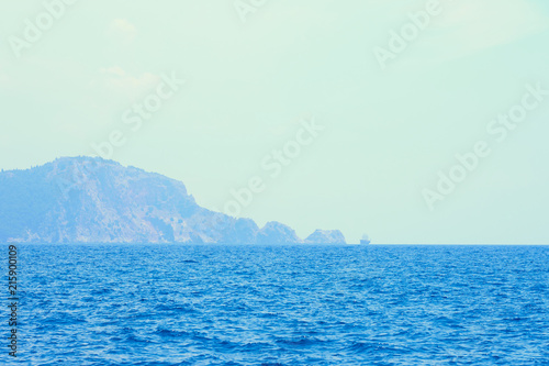 Fototapeta premium Pirate ship and foggy island against a cloudy sky on a sunrise. Seaside of Alanya, Turkey.