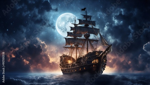 © SeptianHadi, Fototapeta premium Pirate ship flying in the night sky