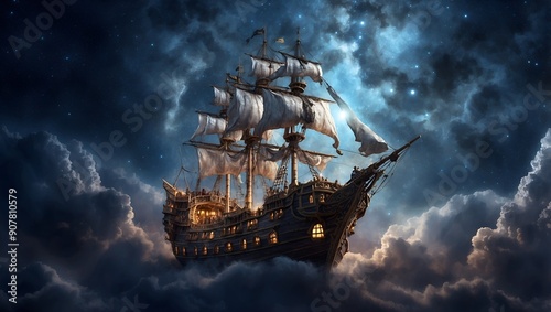 Fototapeta premium Pirate ship flying in the night sky