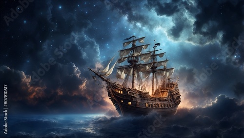 Fototapeta premium Pirate ship flying in the night sky