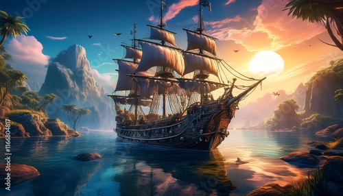 © Yaroslav Khudobyak, Obraz premium pirate ship in the sunset