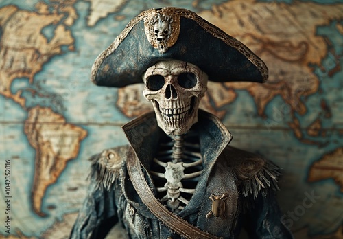 © Obsidian, Fototapeta premium Pirate skull with pirate hat on world map background. Halloween concept