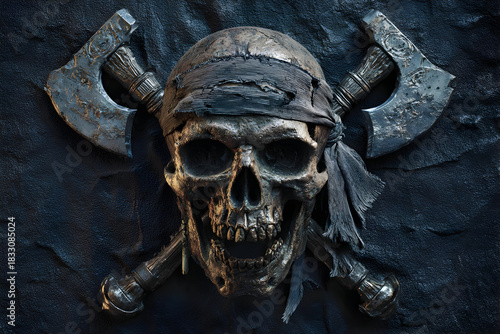 © Svetlana, Fototapeta premium Pirate symbol with grim skull and torn bandana for nautical themed design