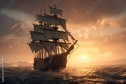 Fototapeta premium pirates ship burning in open sea, night scene with reflection , created using...