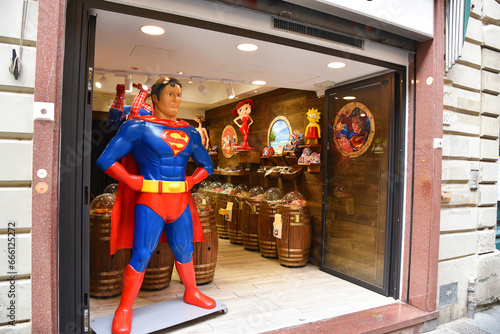 © Bert, Naklejka premium Pisa, Italy. September 16, 2023. A souvenir and candy shop with Superman and Spiderman in Pisa.