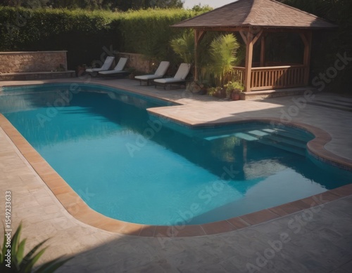 Obraz premium Piscina all'aperto con capanno in legno e lettini.