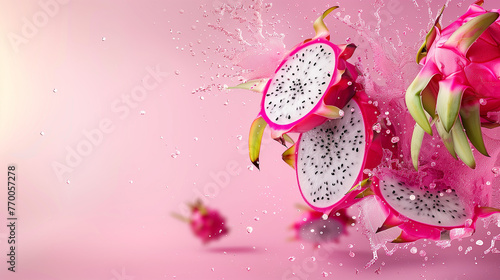 Fototapeta premium Pitaya or dragon fruit levitate on pink background.