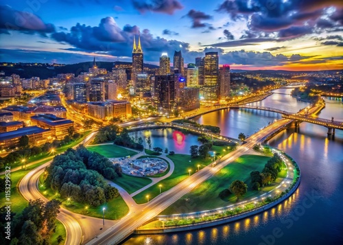 © Arnada, Fototapeta premium Pittsburgh City Point State Park Aerial Long Exposure Photography - Night Cityscape