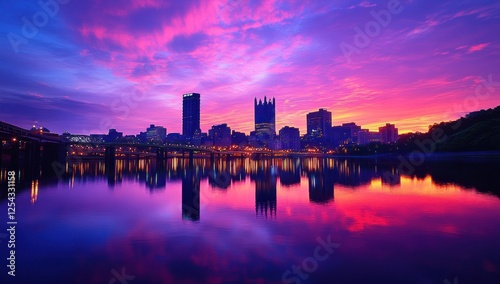 Fototapeta premium Pittsburgh Skyline at Sunrise: A Vibrant Reflection