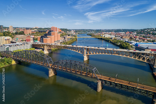 © Mindaugas Dulinskas, Obraz premium Pittsburgh Skyline with Downtown and Business District. Train Bridge and Liberty Bridge.