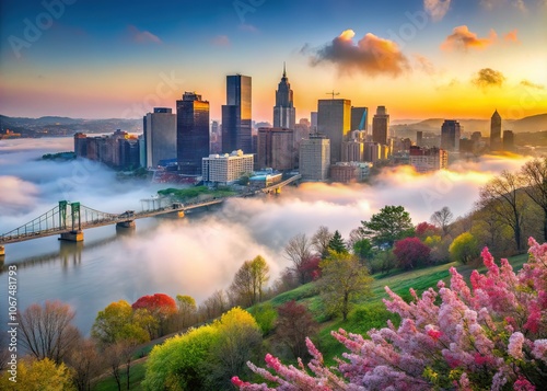 Obraz premium Pittsburgh Spring Foggy Cityscape AI Art