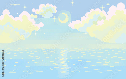 Fototapeta premium (pixel art)穏やかな海と幻想的に星と月が輝く夜空のドット絵風景画