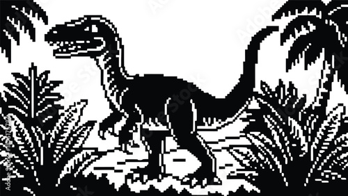 Fototapeta premium Pixel Art 1-Bit Velociraptor Dinosaur Jungle Landscape Scene