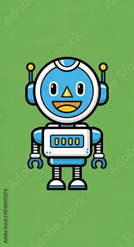 © JSR, Obraz premium Pixel Art Blue Robot Character Standing and Smiling with Antennas and Screen Display on a Simple Green Background A Cheerful Friendly Android
