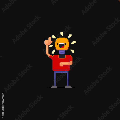 Fototapeta premium Pixel art character with bright bulb in place of his head like he got an idea