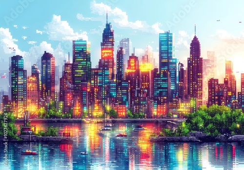 © Digital Dreamscapes, Obraz premium Pixel art city skyline reflecting in a calm river with colorful neon lights and white clouds in a blue sky