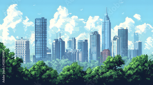 Obraz premium Pixel art city skyline with skyscrapers illustration background