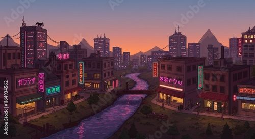 © IbragimovN, Naklejka premium Pixel art cityscape at dusk with neon lights and river