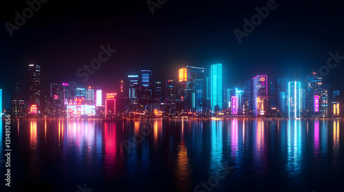 © reza, Fototapeta premium Pixel Art Cityscape At Night With Vibrant Neon Lights Reflecting In The Water With Digital Pixelated Graphic Effect