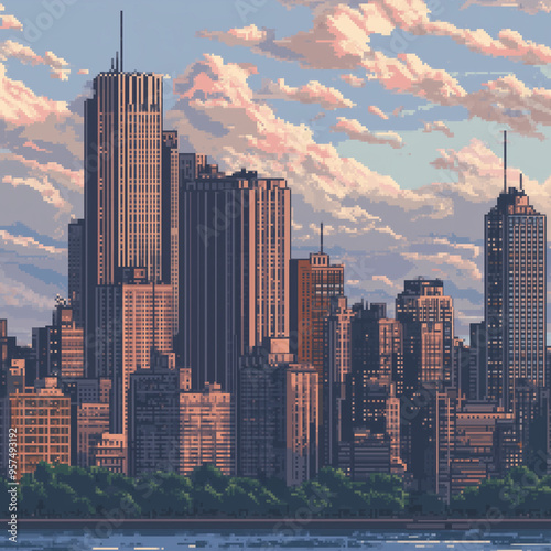 © Stock Creator, Fototapeta premium Pixel Art Cityscape at Sunset with Skyscrapers