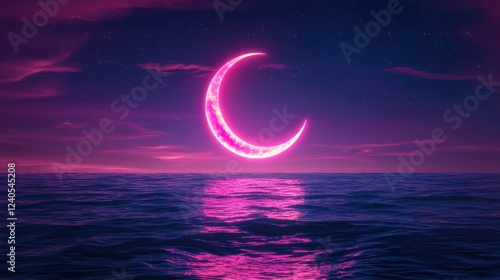 © Phatharaporn, Fototapeta premium Pixel art crescent moon glowing pink over dark purple ocean and night sky with stars. Digital art, vibrant colors, dreamy atmosphere.