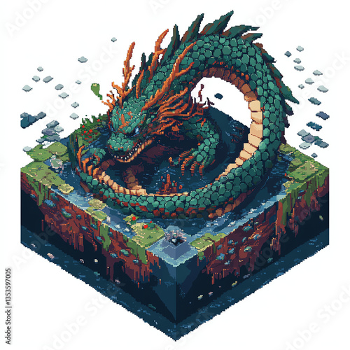 Fototapeta premium Pixel Art Dragon Coiled on Isometric Earth Block Surrounded by Water