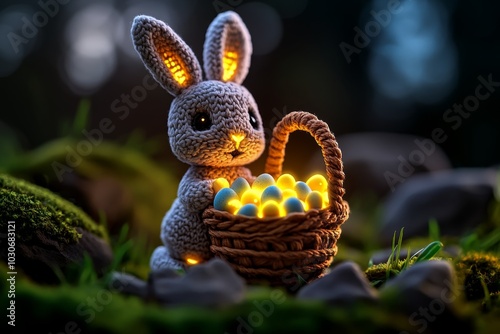 © Thanyarat, Fototapeta premium Pixel art Easter bunny, holding a basket of tiny glowing eggs