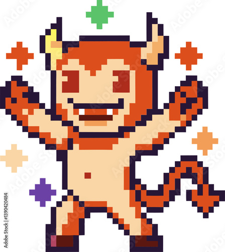 Fototapeta premium Pixel art evil character with horns and tail, celebrating with colorful sparkles around