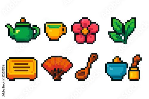 © Hubba Bubba, Fototapeta premium Pixel art food and nature icon set. Retro, tea, plant icons in pixelated style