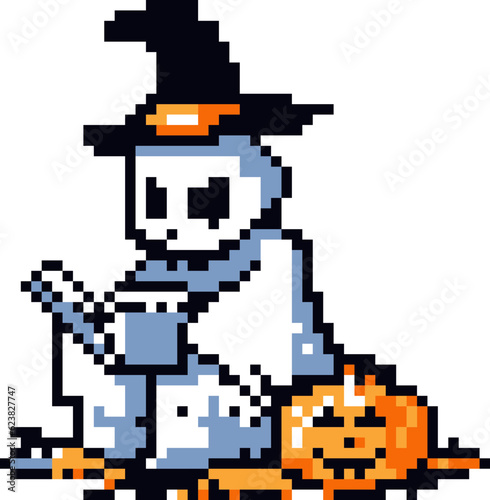 Obraz premium Pixel Art Halloween ghost reading book.